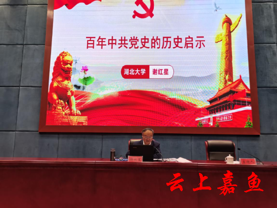 云上嘉鱼报道(记者邓丹)4月23日,党史学习教育省委宣讲团嘉鱼专题报告会在县会议中心举行。省委宣讲团成员、湖北大学党委书记谢红星作专题宣讲,市政协副主席、县委书记胡春雷主持报告会。