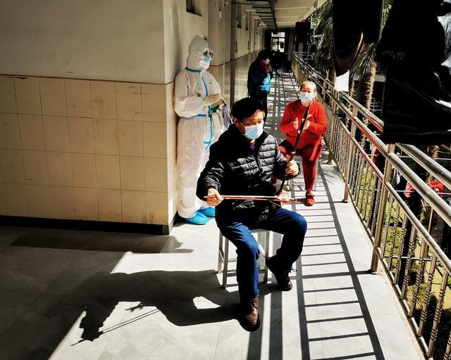 年过60的老周(化名)平日里就喜欢拉一下二胡,一出院他便请家人把自己的二胡送到了隔离点,没事就在房里拉两下。开始的时候医护人员会请他为大家助助兴,一来二去,老周也有了固定观众,而他的二胡演奏也成了楼道里每天的固定节目。