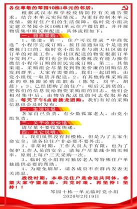 在校党委组织部的牵头组织下,学校琴园小区和忠诚教师公寓各楼栋迅速行动起来,充分发挥基层党组织的凝聚引领作用和党员的示范带动作用,以实际行动开展疫情排查和防控工作,将防控关口从社区下移到小区各楼栋,以行动筑牢“防控墙”。学校社区第一时间成立了47个临时党小组,覆盖学校社区52个楼栋,号召共产党员下沉防疫一线,把疫情斗争作为践行初心的重要考场,共产党员们纷纷化身宣传员、核查员、卫生员、代跑员,冲锋在前、严防死守,与1891户居民一道组成了群防群控严密防线。