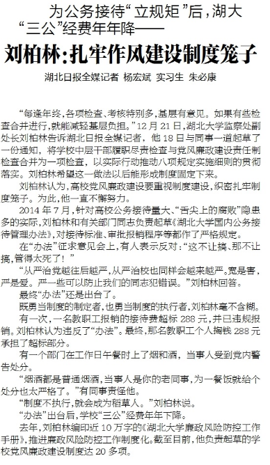 2014年7月,针对高校公务接待量大、“舌尖上的腐败”隐患多的实际,刘柏林和有关部门同志负责起草《湖北大学国内公务接待管理办法》,对接待标准、审批报销程序等都作了严格规定。